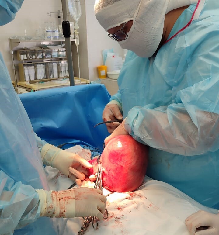 В гинекологическое отделение Нижневартовского перинатального центра поступила пациентка 52 лет по направлению врачебной комиссии для планового оперативного вмешательства. Основной жалобой при обращении были тянущие боли внизу живота с нарастанием их интенсивности и увеличением размеров живота в последние пять месяцев. На проведенном пациентке УЗИ органов малого таза было обнаружено увеличение тела матки до размеров, как при 30 неделях беременности. Учитывая гигантские размеры миомы, возраст пациентки, было принято решение о проведении гистерэктомии лапаротомическим (через разрез брюшной стенки) доступом.