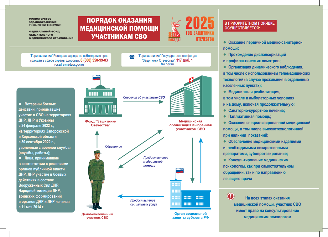 Сегодня особое внимание уделяется медицинскому обеспечению участников специальной военной операции. Система медицинского обеспечения участников специальной военной операции постоянно совершенствуется, что позволяет оперативно и эффективно реагировать на возникающие вопросы. Более подробную информацию вы сможете узнать в инфографике выше