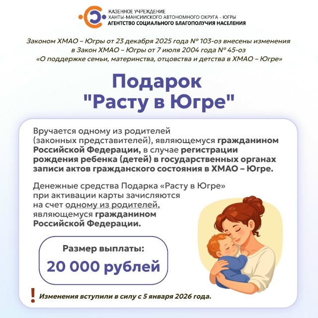 С 5 января 2026 года подарок «Расту в Югре» вручается одному из родителей (законных представителей), являющемуся гражданином Российской Федерации, в случае регистрации рождения ребенка (детей) в государственных органах записи актов гражданского состояния в Ханты-Мансийском автономном округе - Югре. В состав подарка входит шкатулка с мамонтенком и карточкой с QR-кодом внутри. Активировав QR-код, родители могут получить денежные средства в размере 20 000 рублей, а также ссылки на полезные сервисы для мам и пап.